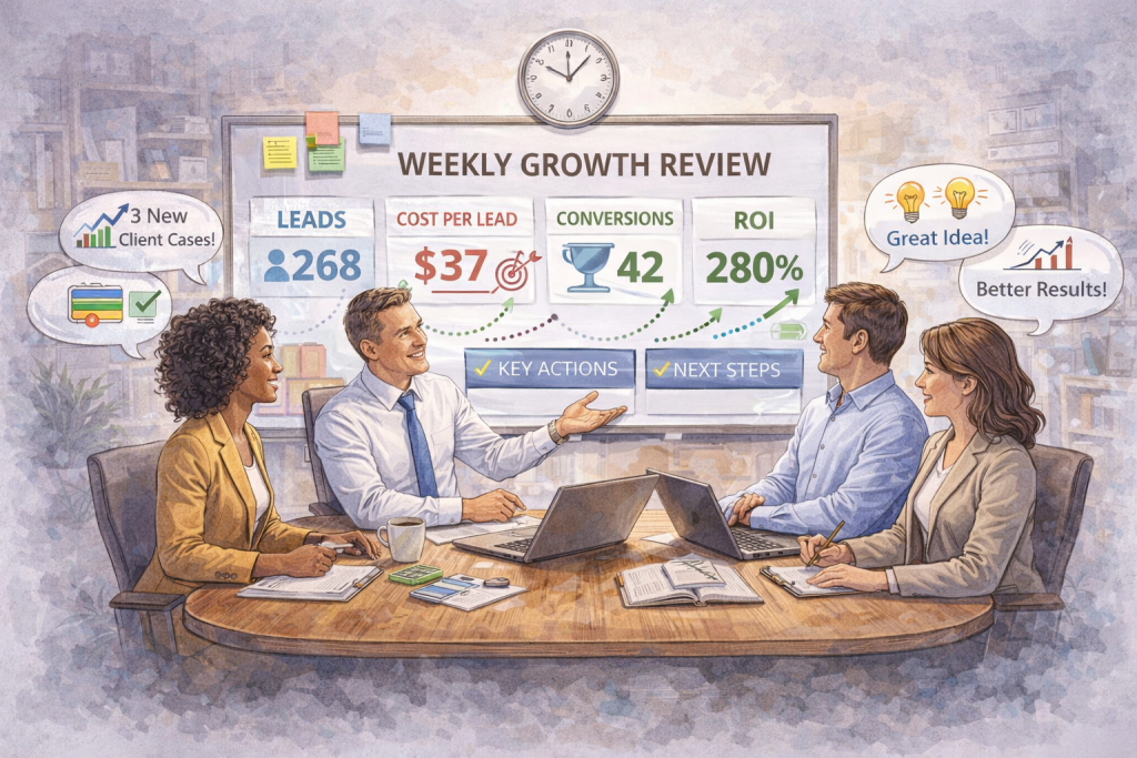 That meeting is a 15-minute weekly growth review. It happens every Monday morning. It follows a fixed agenda. It produces specific decisions. And it replaces every other unstructured, reactive, time-consuming way the managing partner currently tries to stay on top of marketing, intake, and growth.